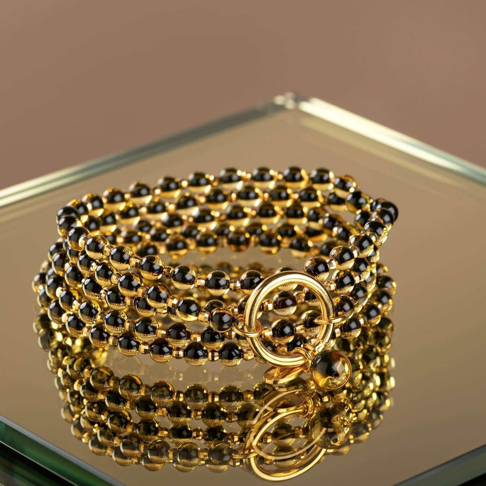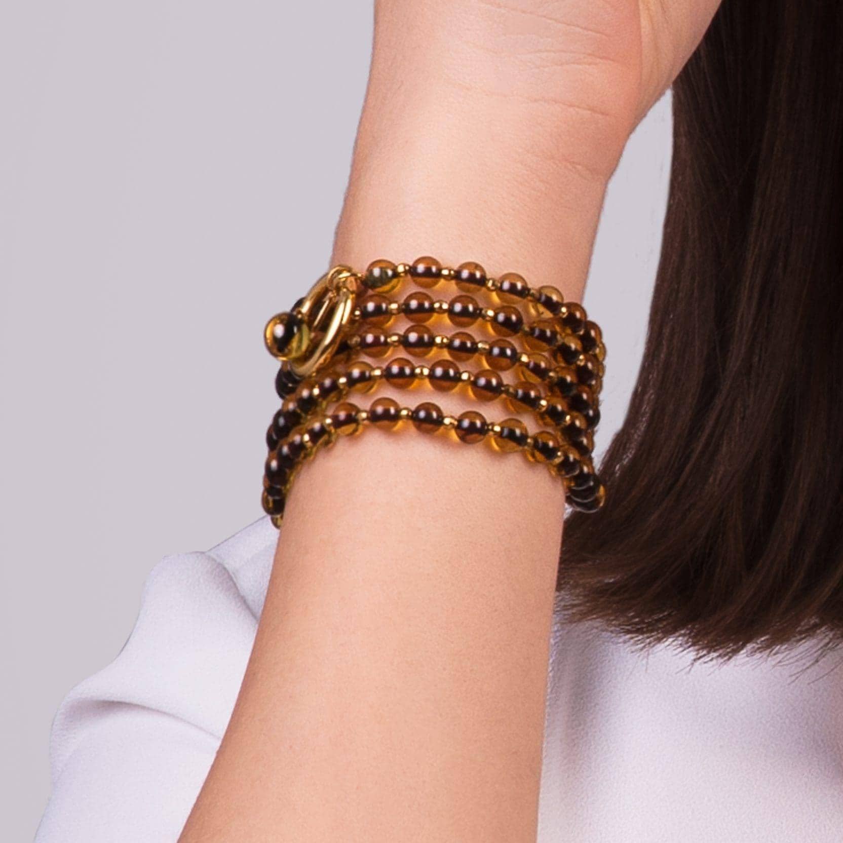 Add a golden glow to your style with this versatile 5-strand gemstone bracelet Tiger, handcrafted from genuine Baltic gemstone amber and finished with luxe 24k gold vermeil details. Each bead is treated with precision to achieve a radiant honey yellow tone that resembles the shimmer of tiger eye — rich, warm, and timeless.