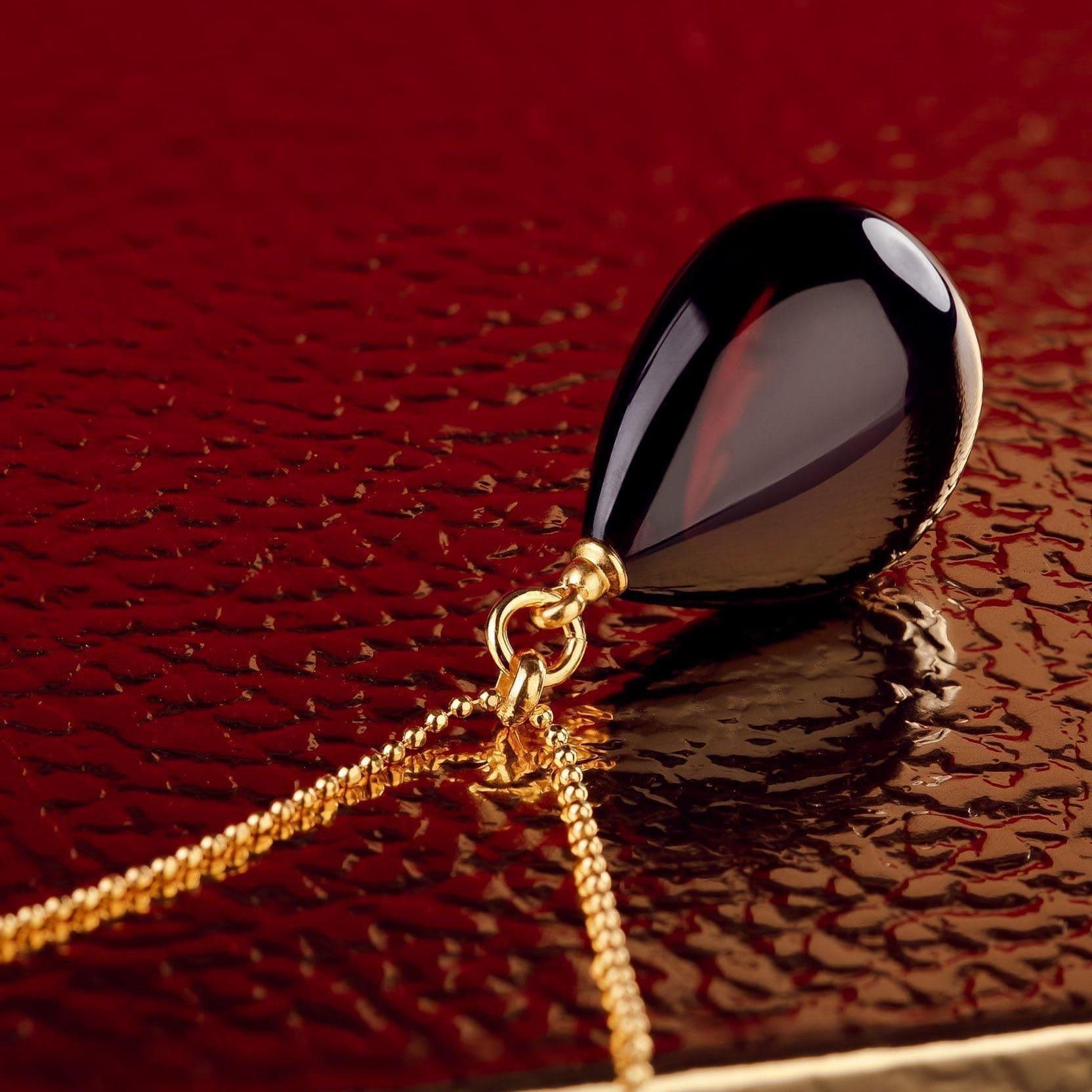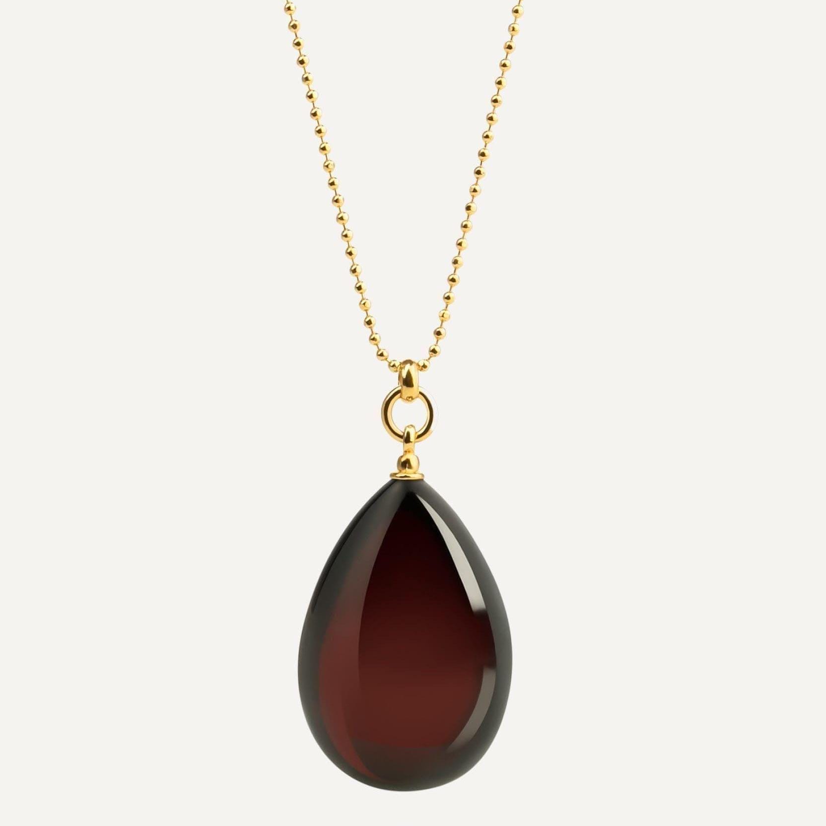 24k Gold vermeil chain necklace with unique shape Baltic amber pendant is your statement defining elegant style and timeless values. The teardrop gemstone shape reveals the purines of genuine Baltic amber and the unique cherry/red color adds warmth to this piece of jewelry. Pendant is handcrafted from genuine amber which is polished and treated with special technology to achieve this unique form and color. A true feat of master craftsmanship, this necklace showcases the utmost precision and attention to detail.