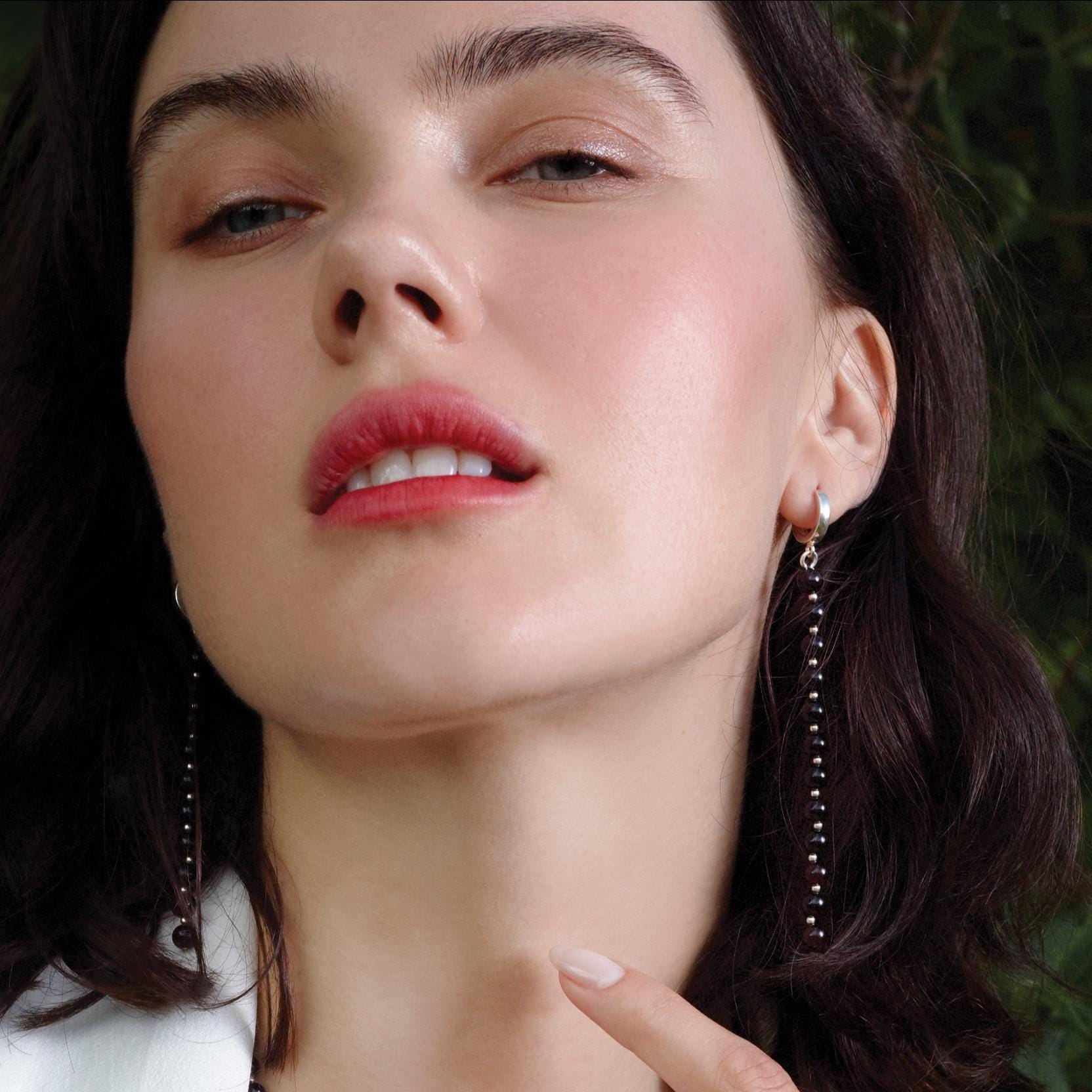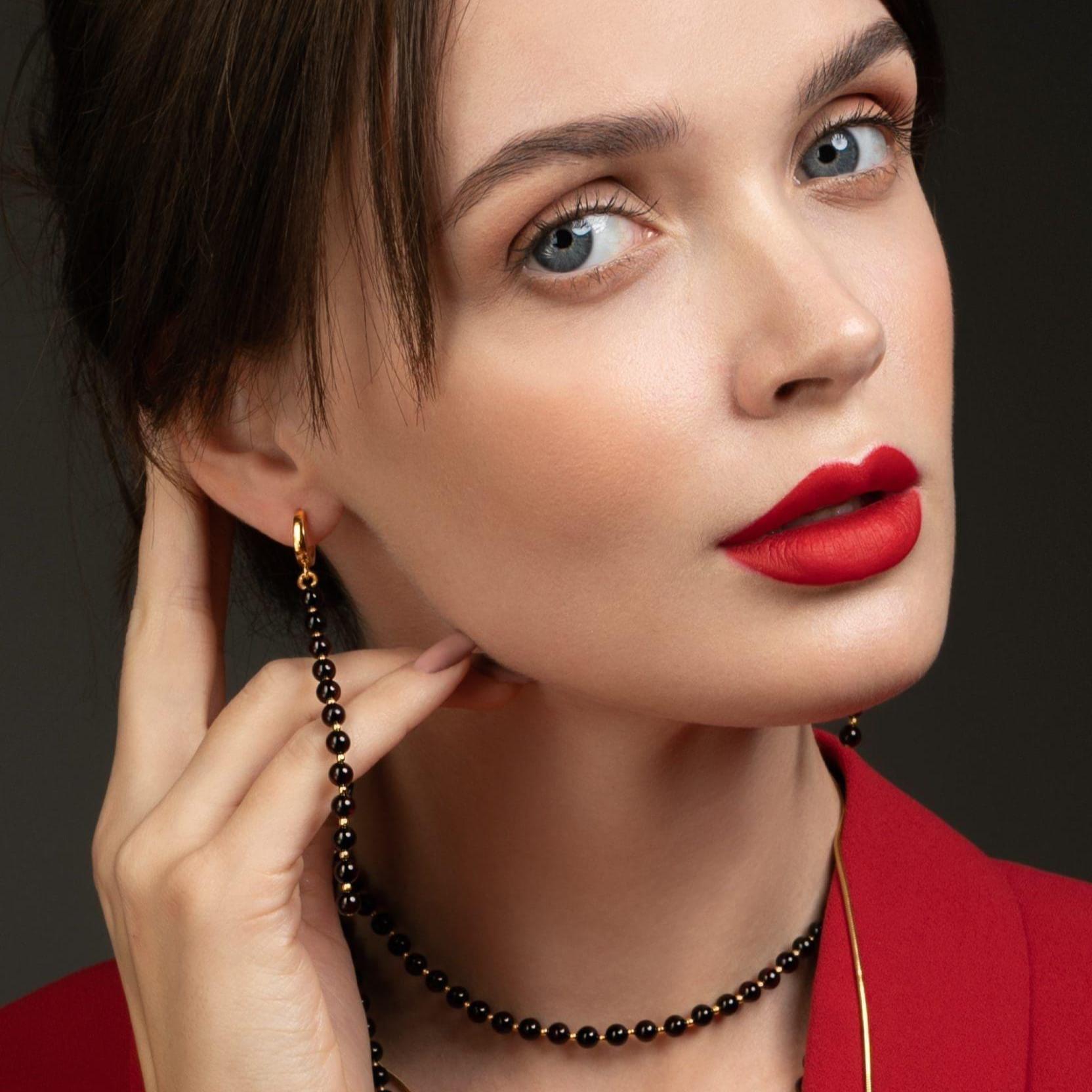 Wearing the long silver CHERRY earrings will delicately accentuate the neckline, while the rich Baltic cherry amber adds expressiveness to your overall look. These modern amber drop earrings are designed to make you feel truly special. Although, the glossy polished amber surface can appear quite dark, almost black, when held up to the light, it unveils a luxurious cherry hue, adding a touch of depth and allure to the long beaded earrings.