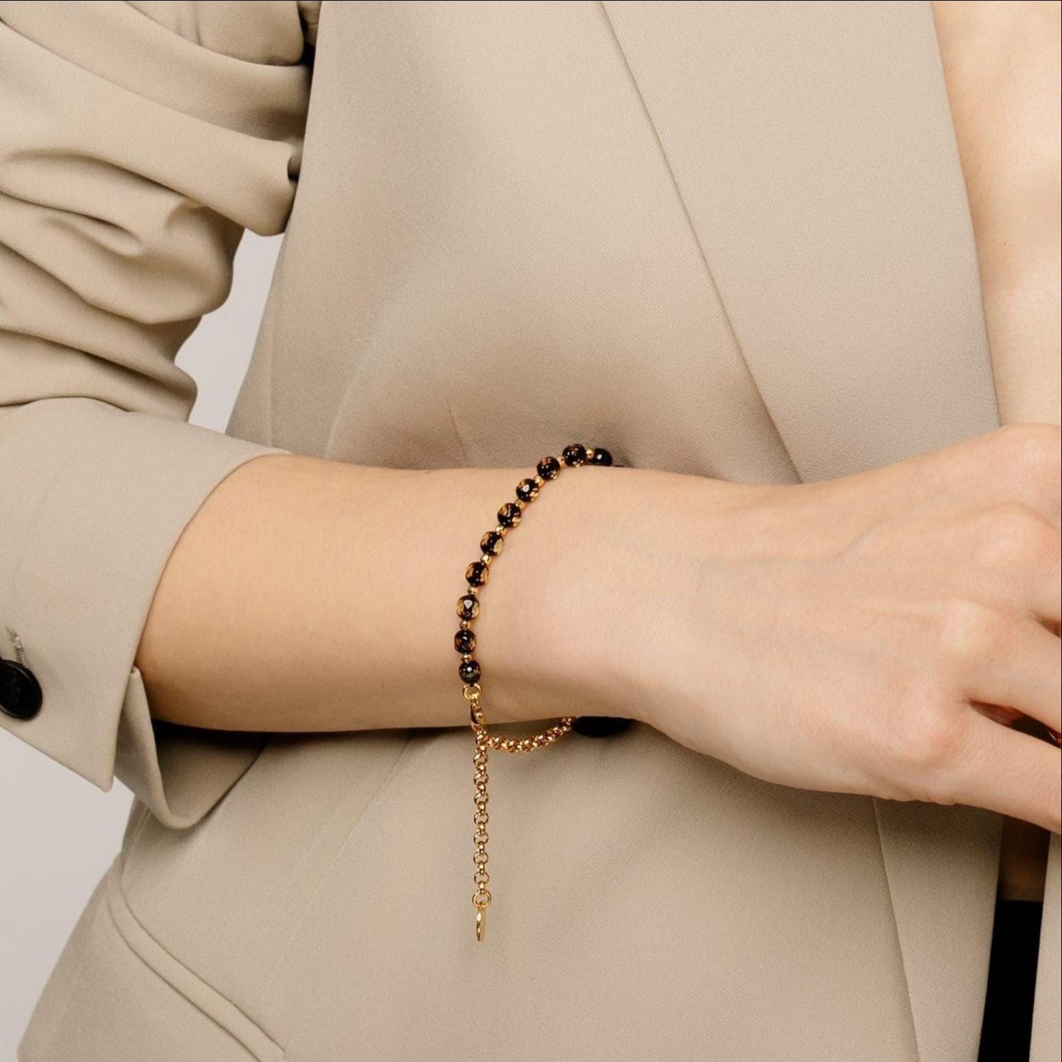 BLISS faceted amber bracelet effortlessly pairs with various outfits and complements your other jewelry pieces. Its comfortable design ensures that you can enjoy wearing this amber crystal bracelet every day, and the adjustable size allows you to achieve the perfect level of looseness for your bracelet. Brightly polished faceted amber edges create a sparkling, multi-colored brilliance. One side of the amber may appear dark cherry, almost like black, while the other side can exhibit greenish or a transparent honey shade, adding a unique charm to this elegant bracelet.