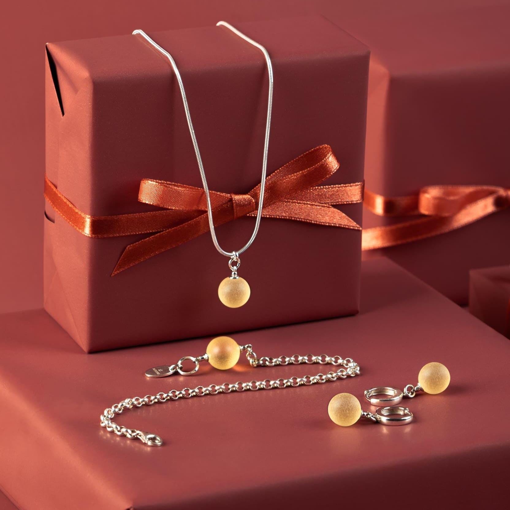 Enhance your everyday look with this amber jewelry set from LEMON collection, featuring genuine yellow amber and 925 sterling silver. This minimalist 3-piece set includes a sterling silver necklace, amber drop earrings, and a delicate amber charm bracelet – perfect for adding timeless warmth to any outfit.