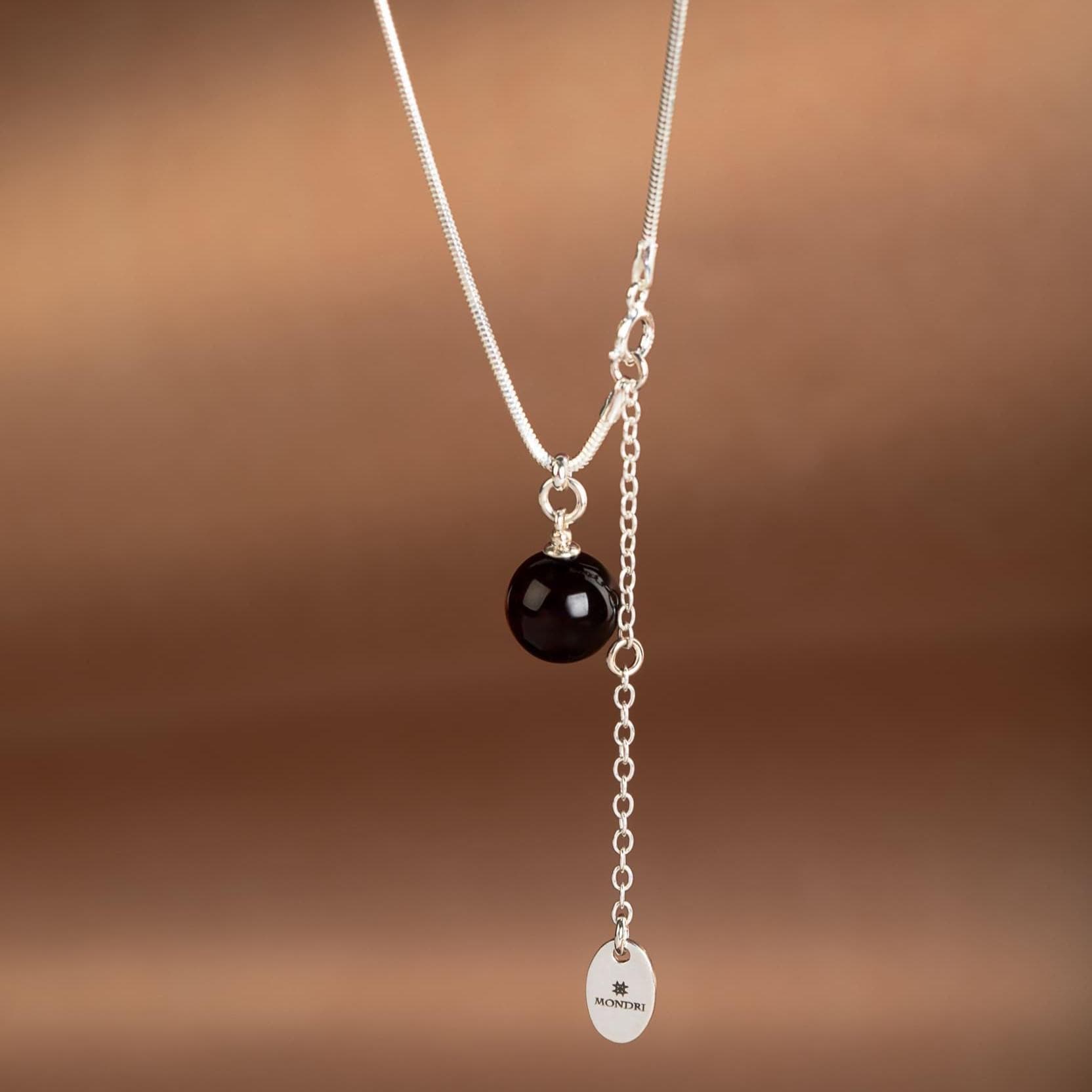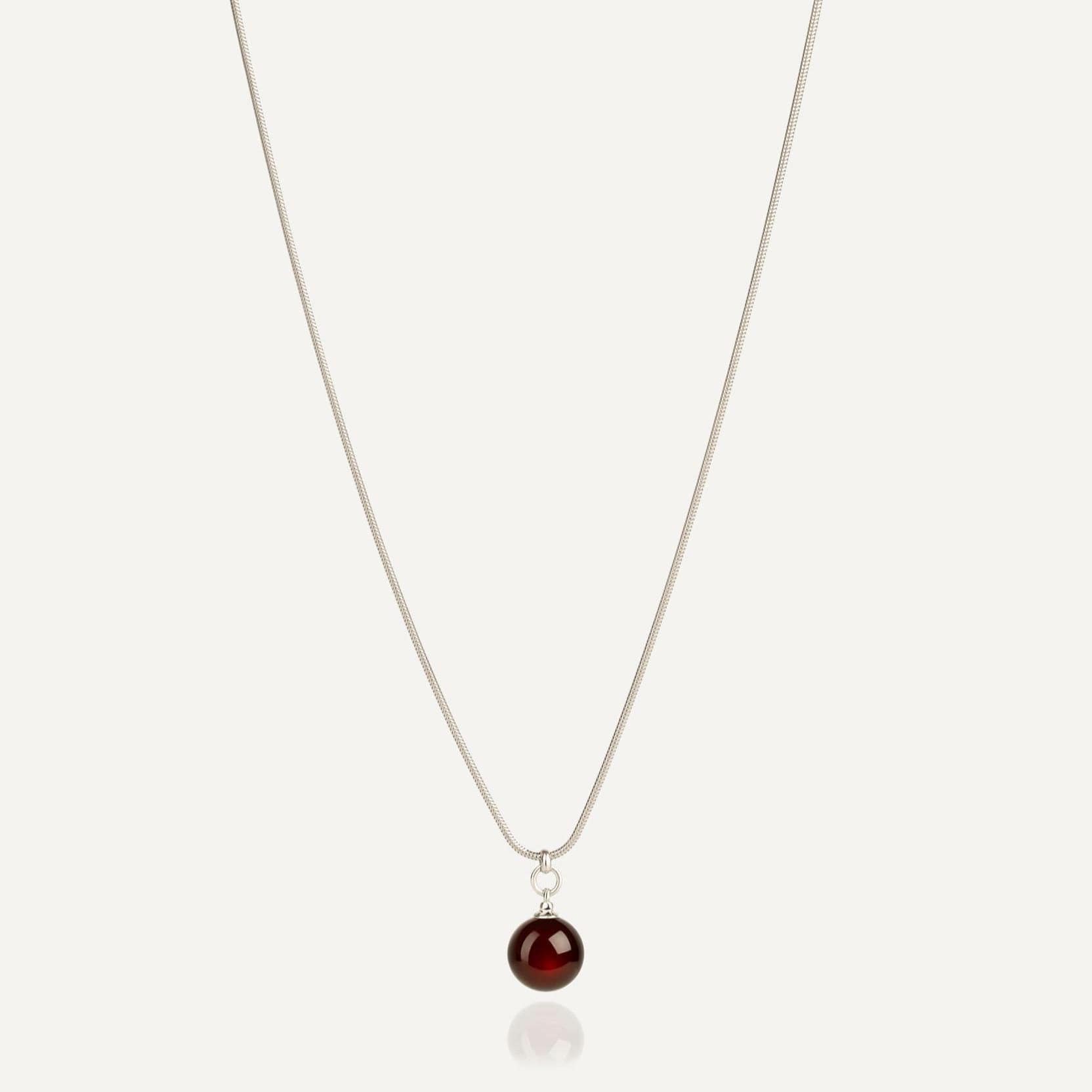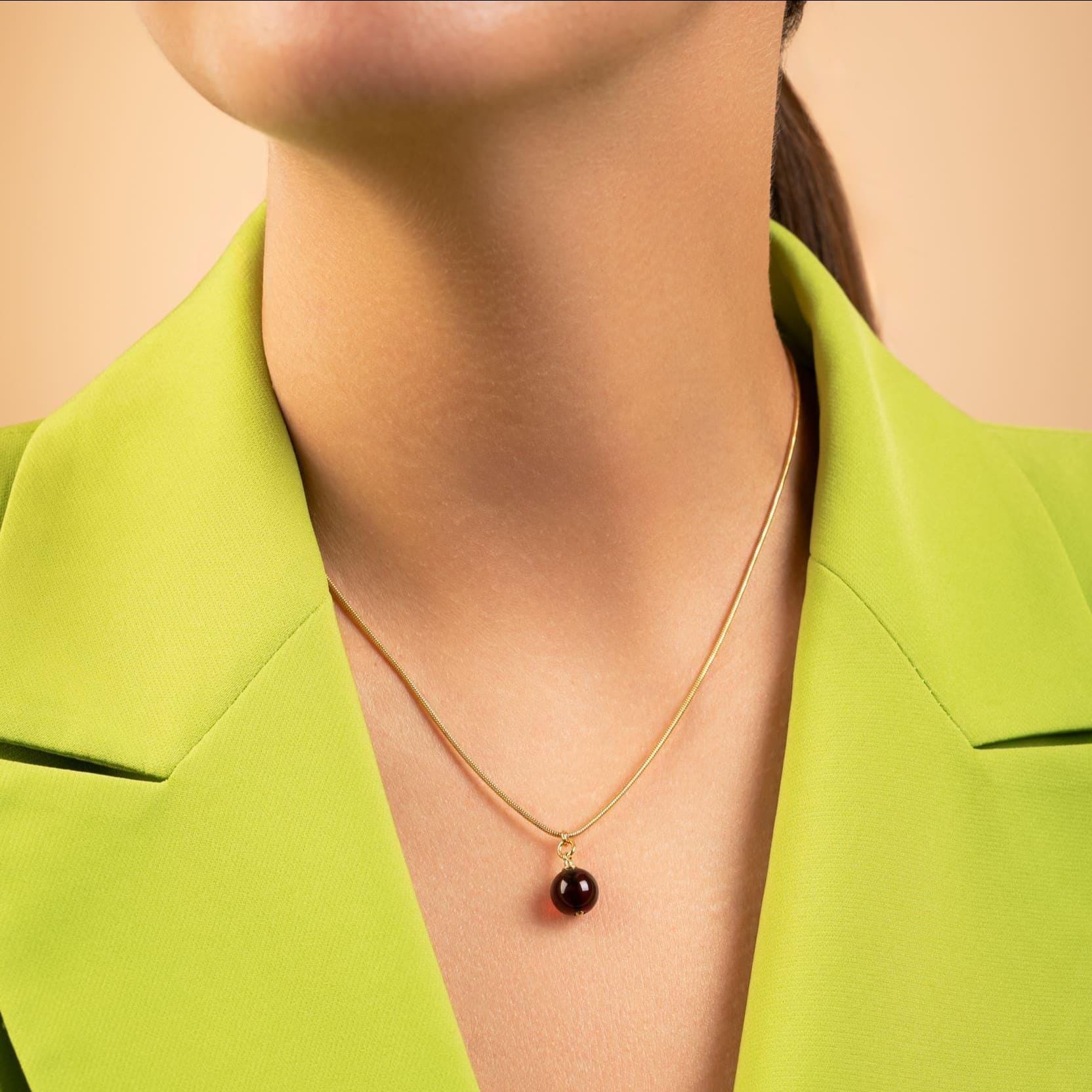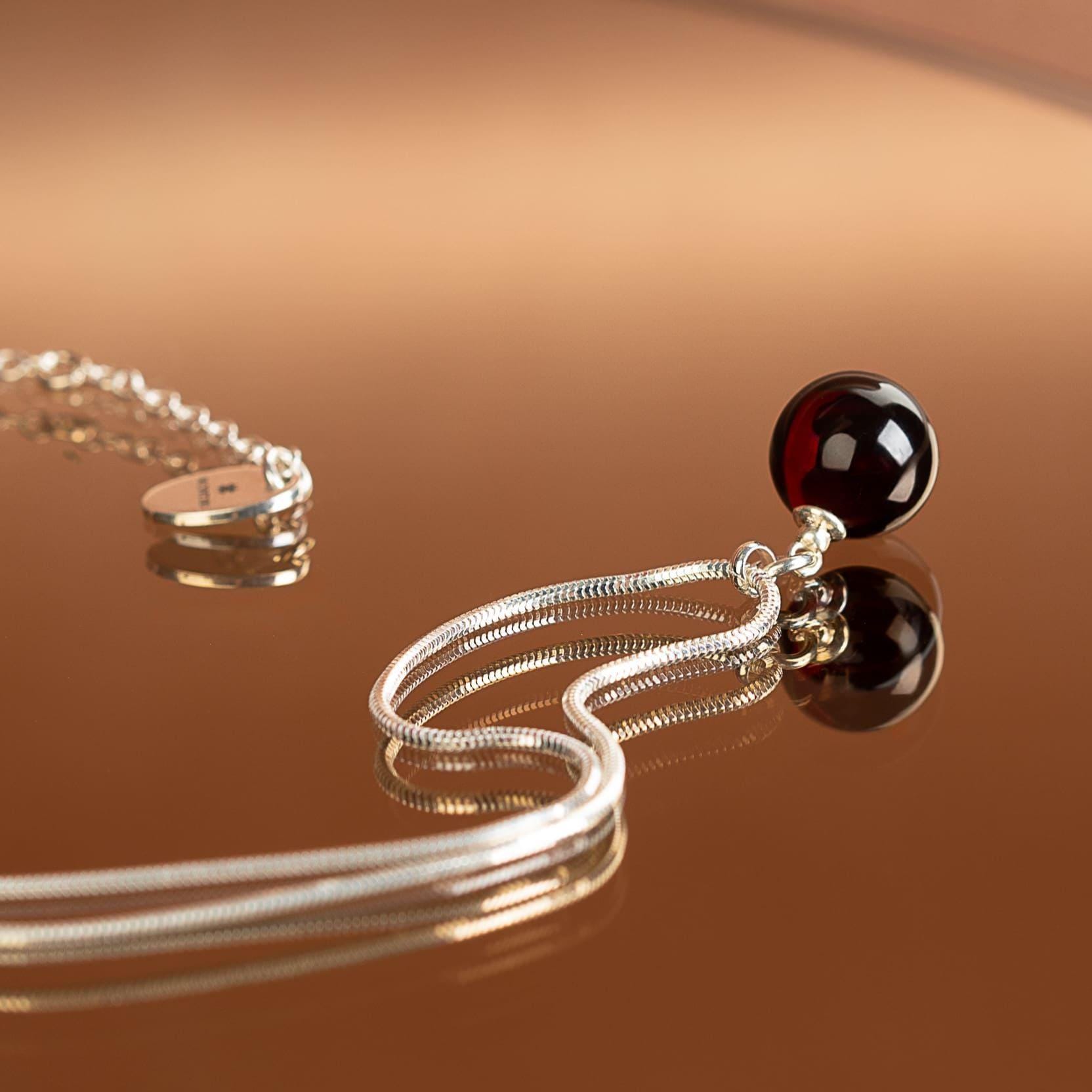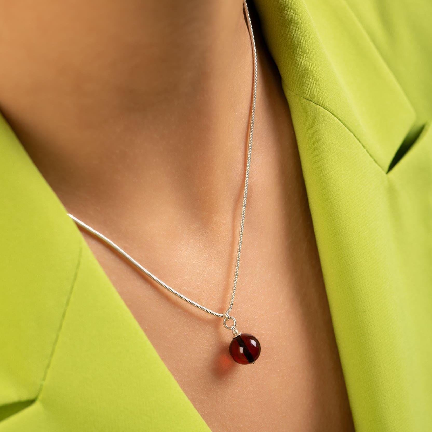 Discover the CHERRY silver necklace adorned with cherry amber pendant, a delicate jewelry piece that effortlessly complements both your everyday outfits and holiday attire. The glossy, polished red amber surface may initially appear strikingly dark, almost black, but when exposed to light, it unveils a luscious and rich cherry hue. For added convenience, the round amber pendant boasts an adjustable chain, allowing you to customize its length to your liking, ranging from 40 cm to 45 cm, ensuring a perfect fit for your style.
