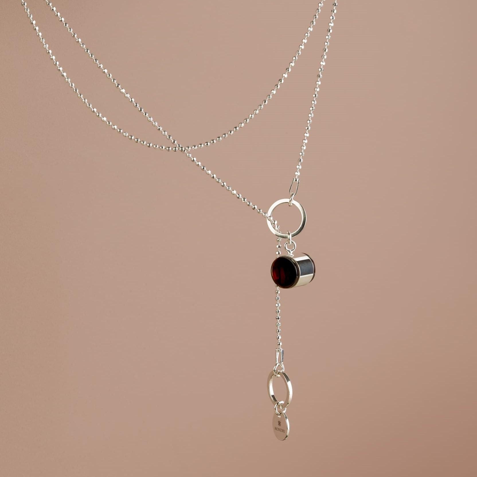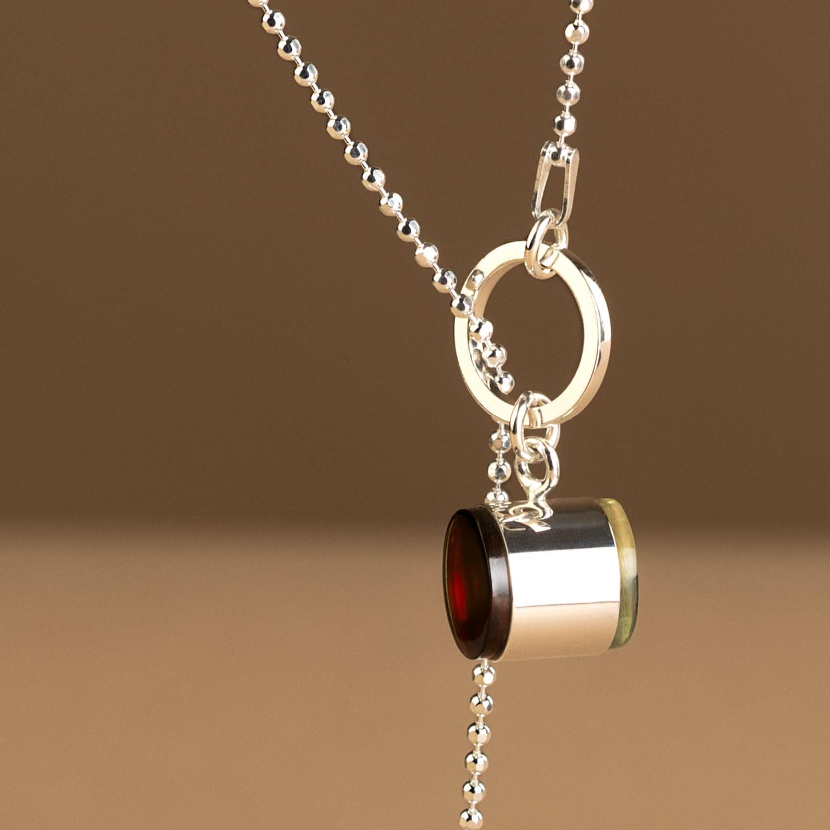 CALICE necklace with a cylindrical pendant stands out for its modern elegance and thoughtful design. The gold- vermeil chain rests gracefully along the neckline, adding warmth and subtle glow, while the deep cherry-toned Baltic amber reveals a mysterious depth and refined dual tone.