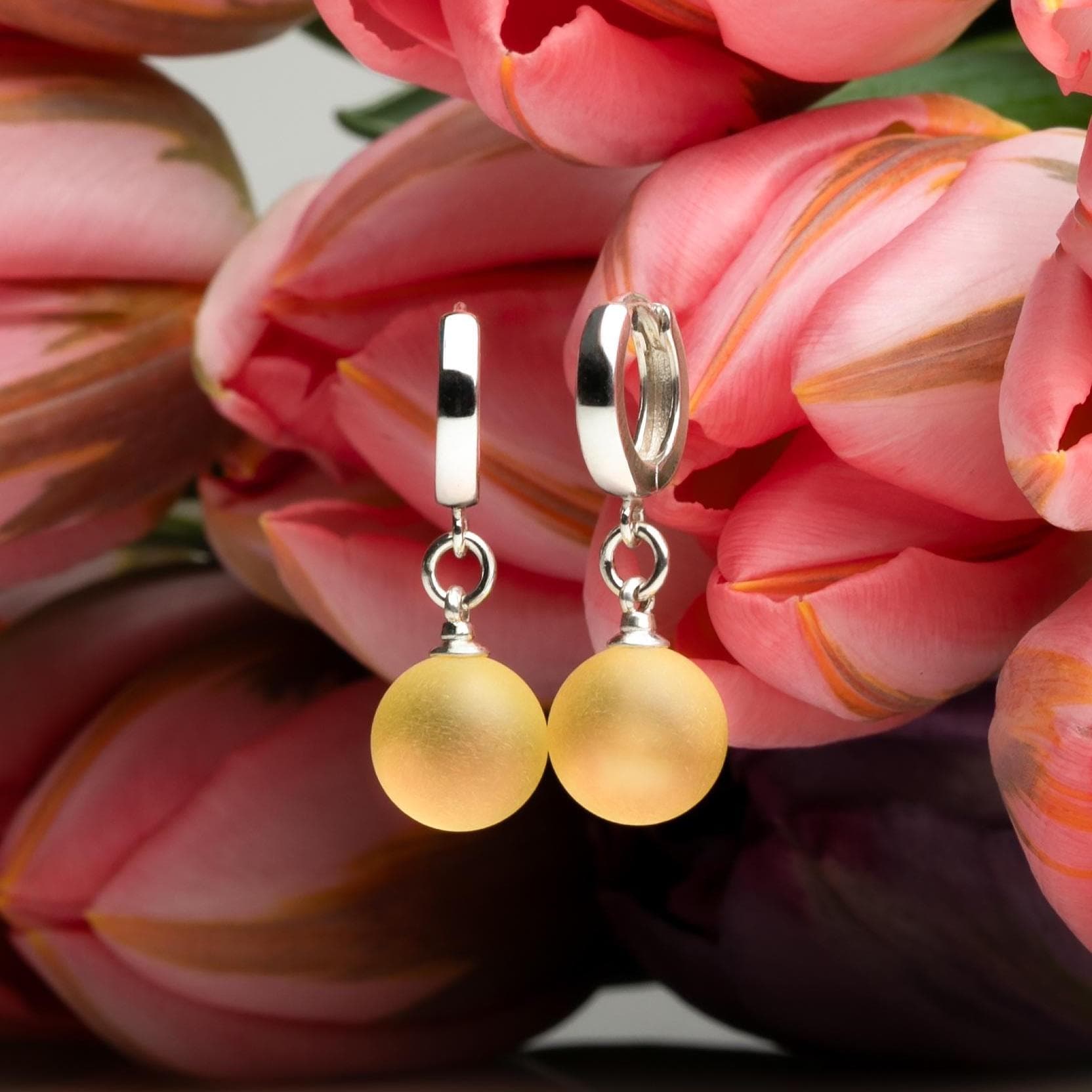 Yellow genuine Baltic amber drop earrings are made from 925 sterling silver and decorated with unique matted amber beads. These minimalist earrings with amber from LEMON AMBER collection are exceptional by specific way of amber polishing - amber beads look like frosted!