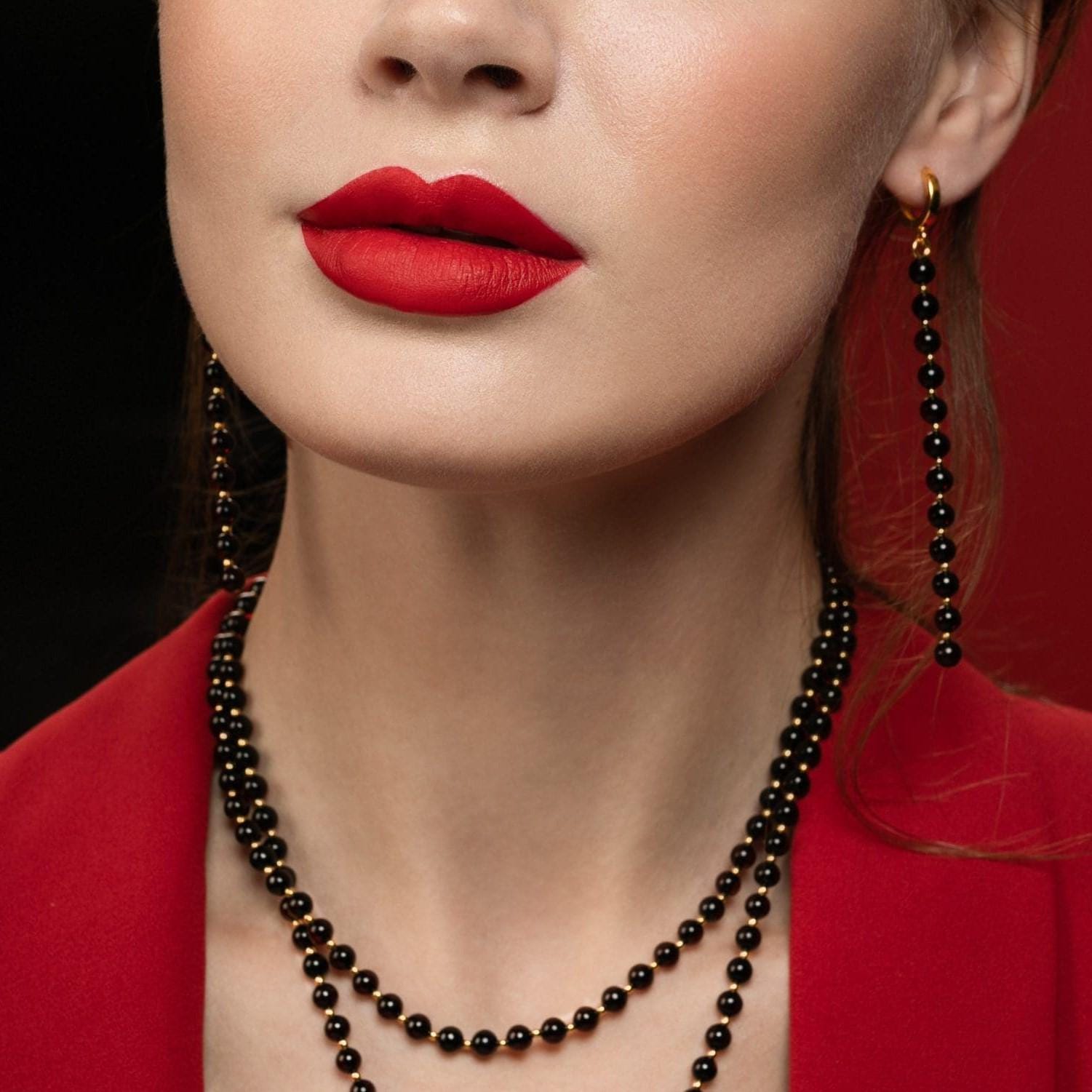 Wearing BLACK CHERRY long beaded earrings will delicately accentuate the neckline, while the rich cherry amber adds expressiveness to your overall look. These modern cherry amber earrings are designed to make you feel truly special. Although, the glossy polished amber surface can appear quite dark, almost black, when held up to the light, it unveils a luxurious cherry hue, adding a touch of depth and allure to the long amber earrings.