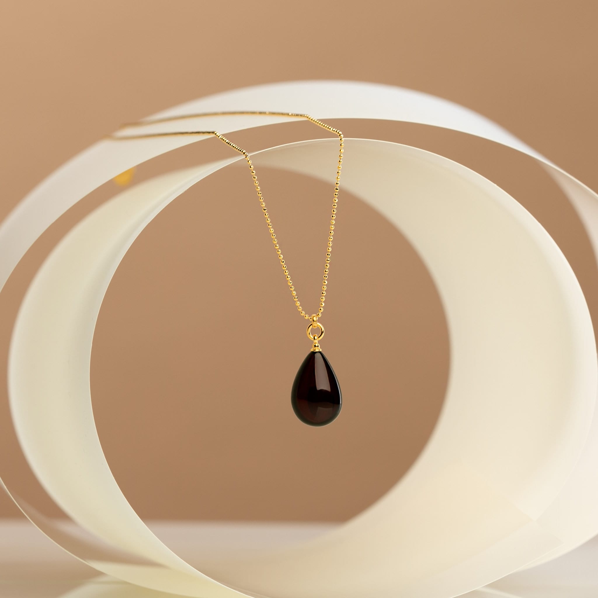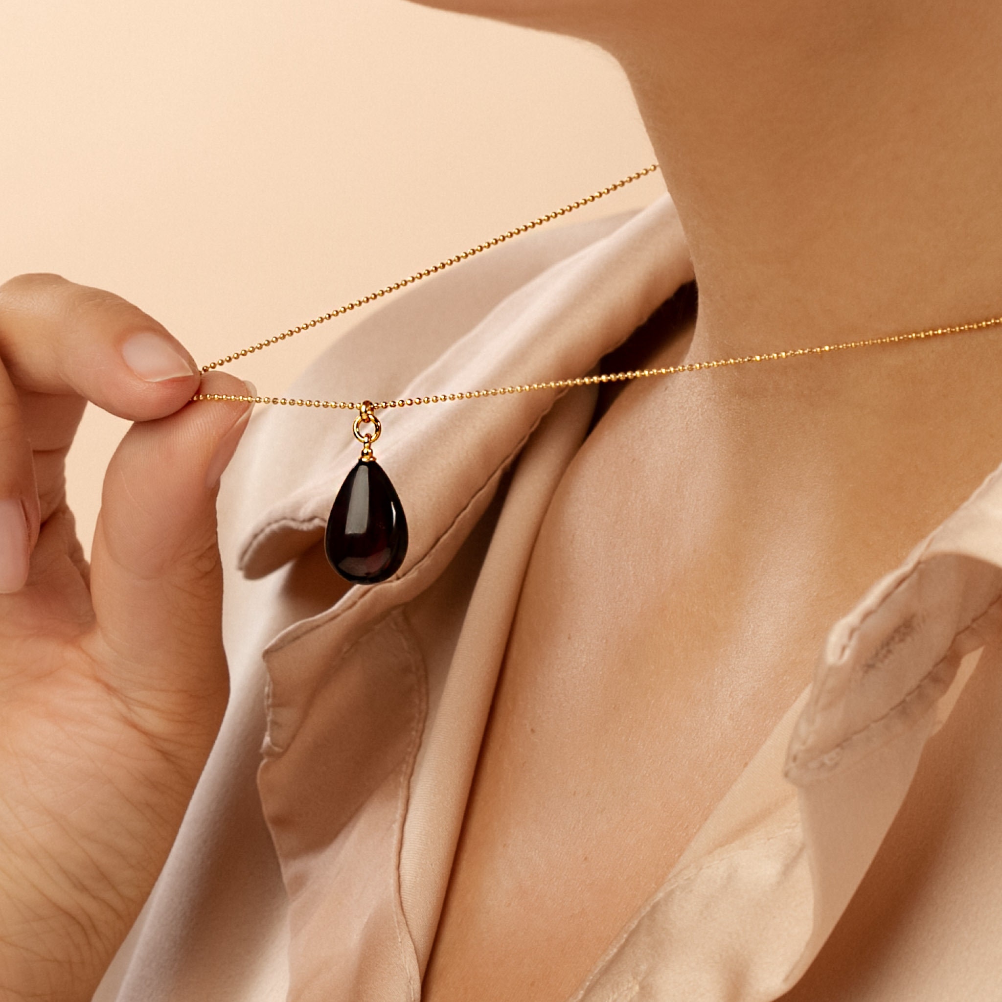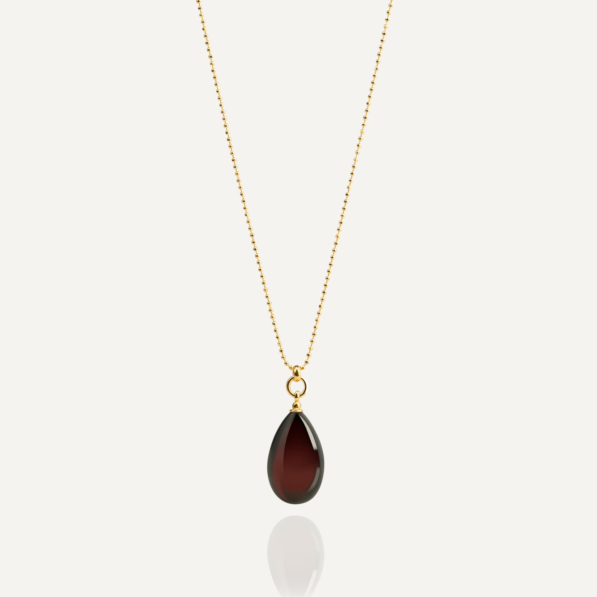 Meet CHERRY DROP—a bold and elegant teardrop pendant necklace handcrafted from genuine Baltic amber. Its rich cherry red shade is nearly black in low light but comes alive in the sun with warm, wine-red tones. Suspended on a minimalist 24k gold vermeil chain, it’s made to elevate your everyday—and stun at special moments.