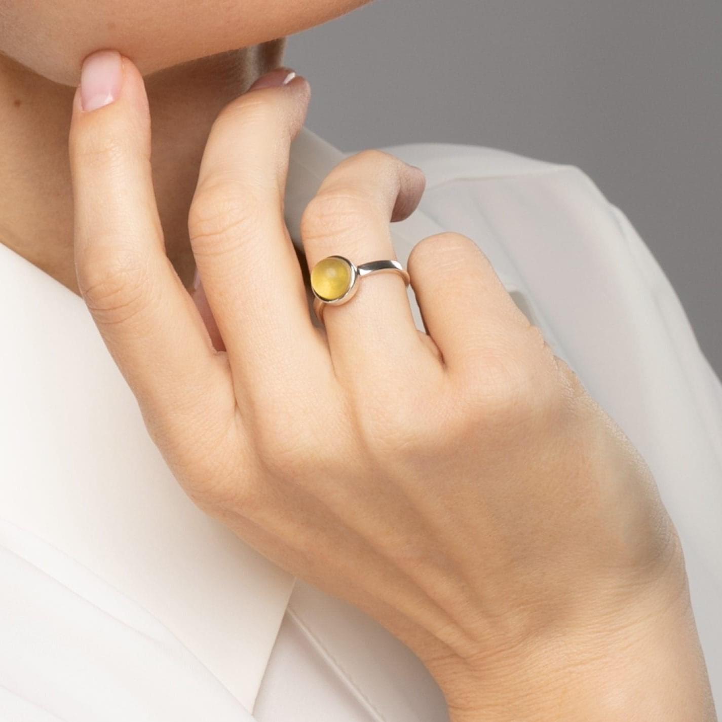 Introducing the AUREA LEMON round amber ring, a chic accessory designed to effortlessly elevate your everyday style. Crafted with a minimalist design, this amber and silver ring features a yellow lemon amber surface that’s meticulously dry-polished, lending it a matte, opaque finish akin to a delicate frosty touch. Minimalist Baltic amber ring is sure to make a stylish statement in your ensemble. This cozy, classic-style yellow amber ring is perfect both as a modern, alternative amber engagement ring.