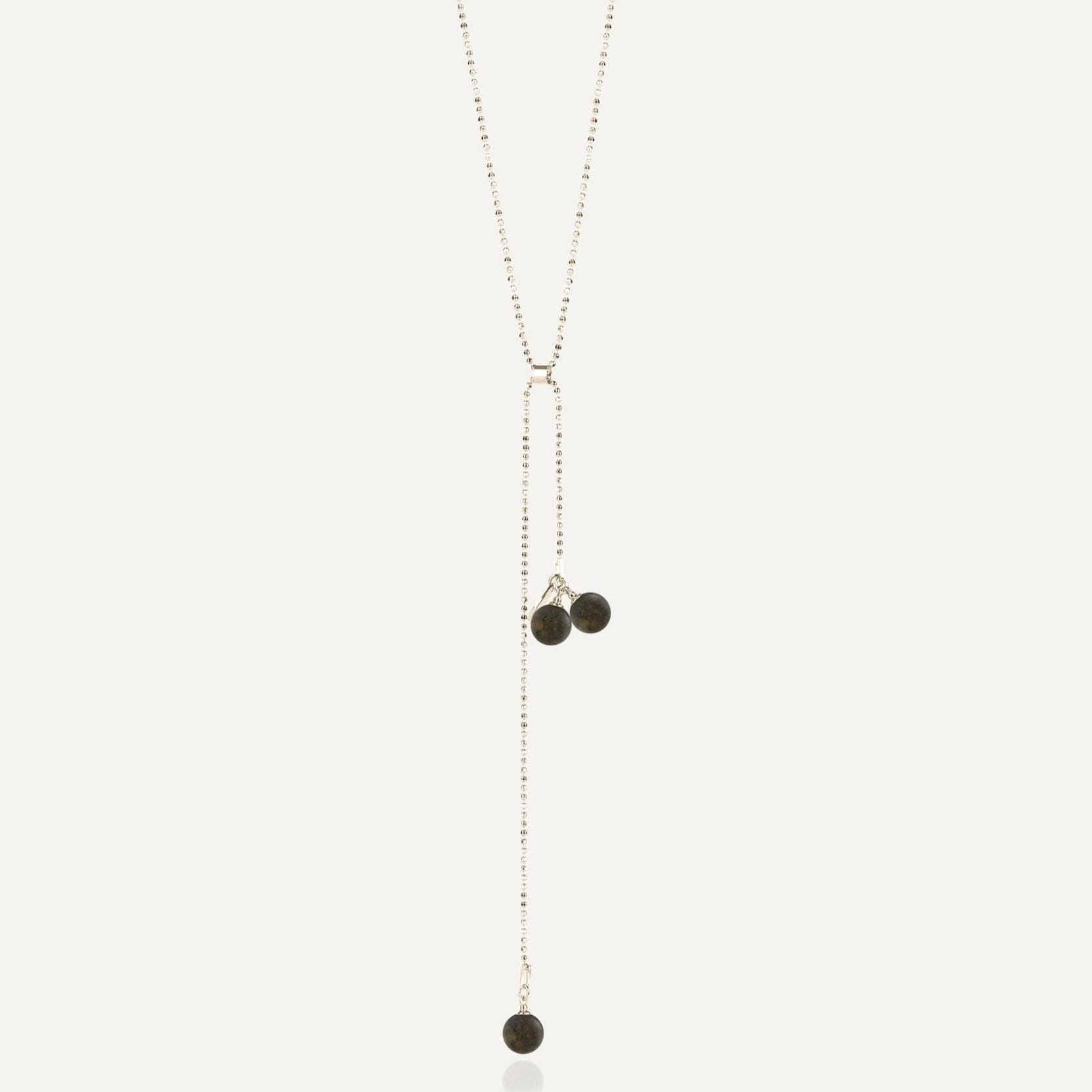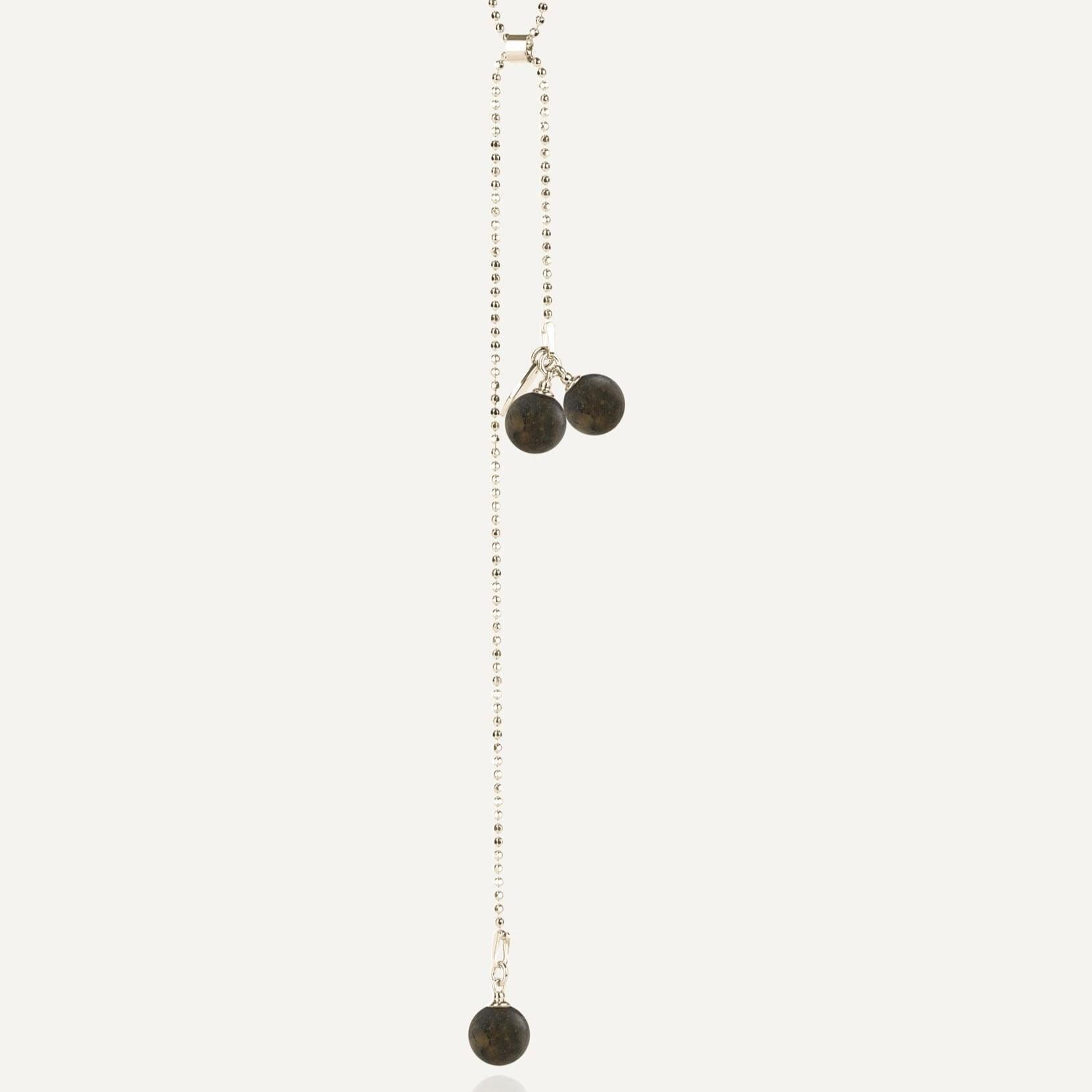 This modern and minimalist lariat pendant necklace is both simple and extraordinary, designed with three shimmering charms of genuine Baltic amber in deep black. The unique Y-shape silhouette creates a versatile piece that radiates feminine warmth and timeless elegance.